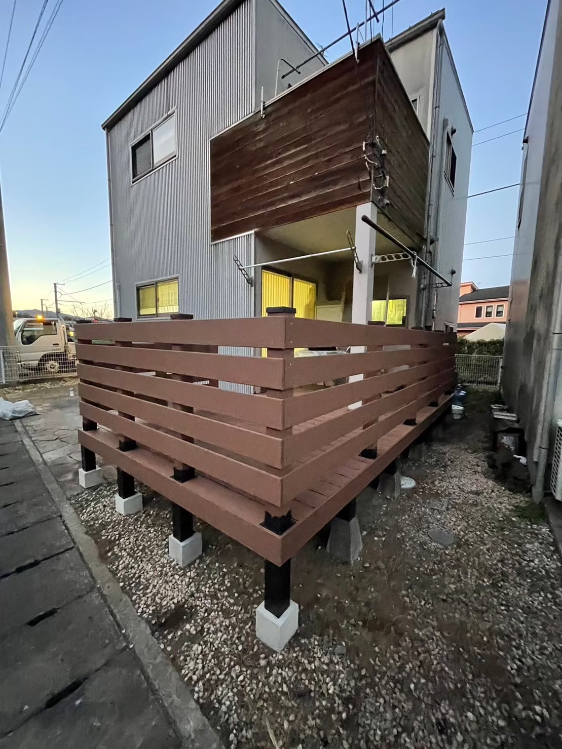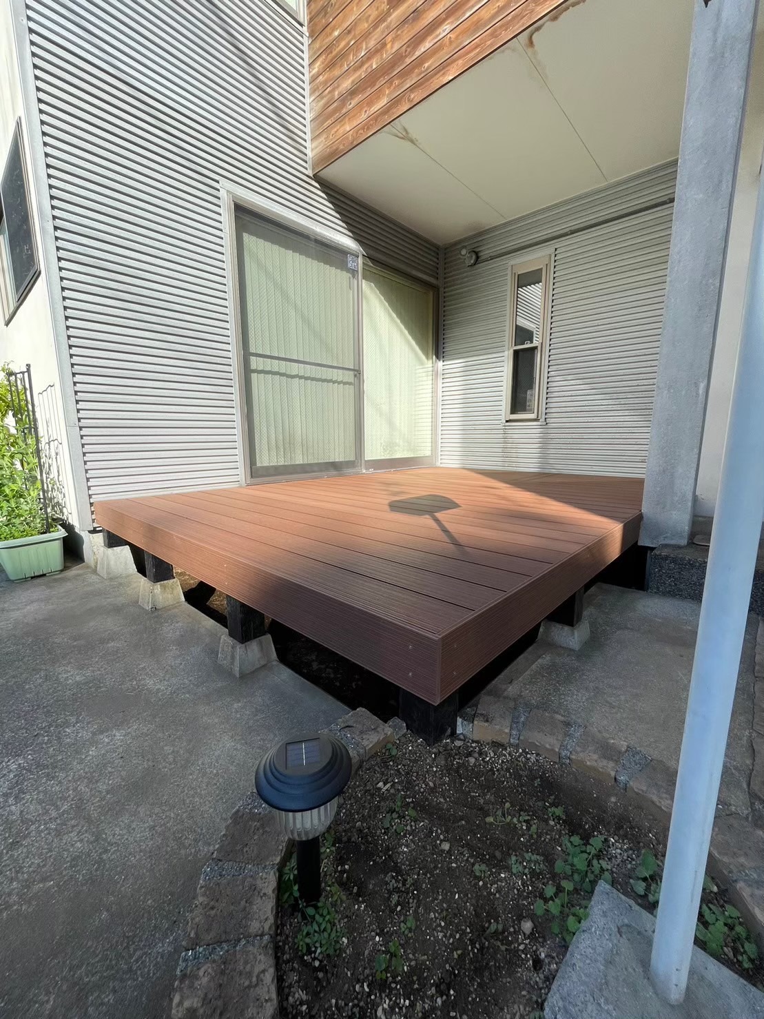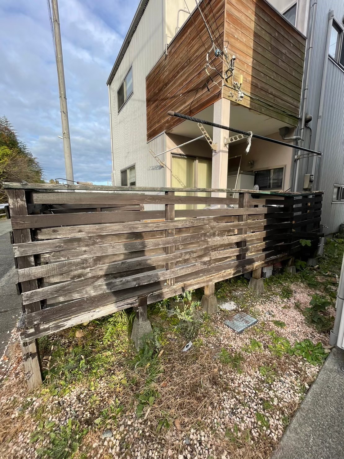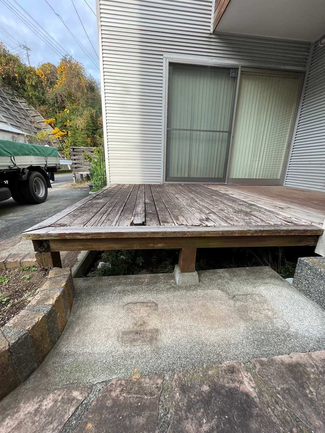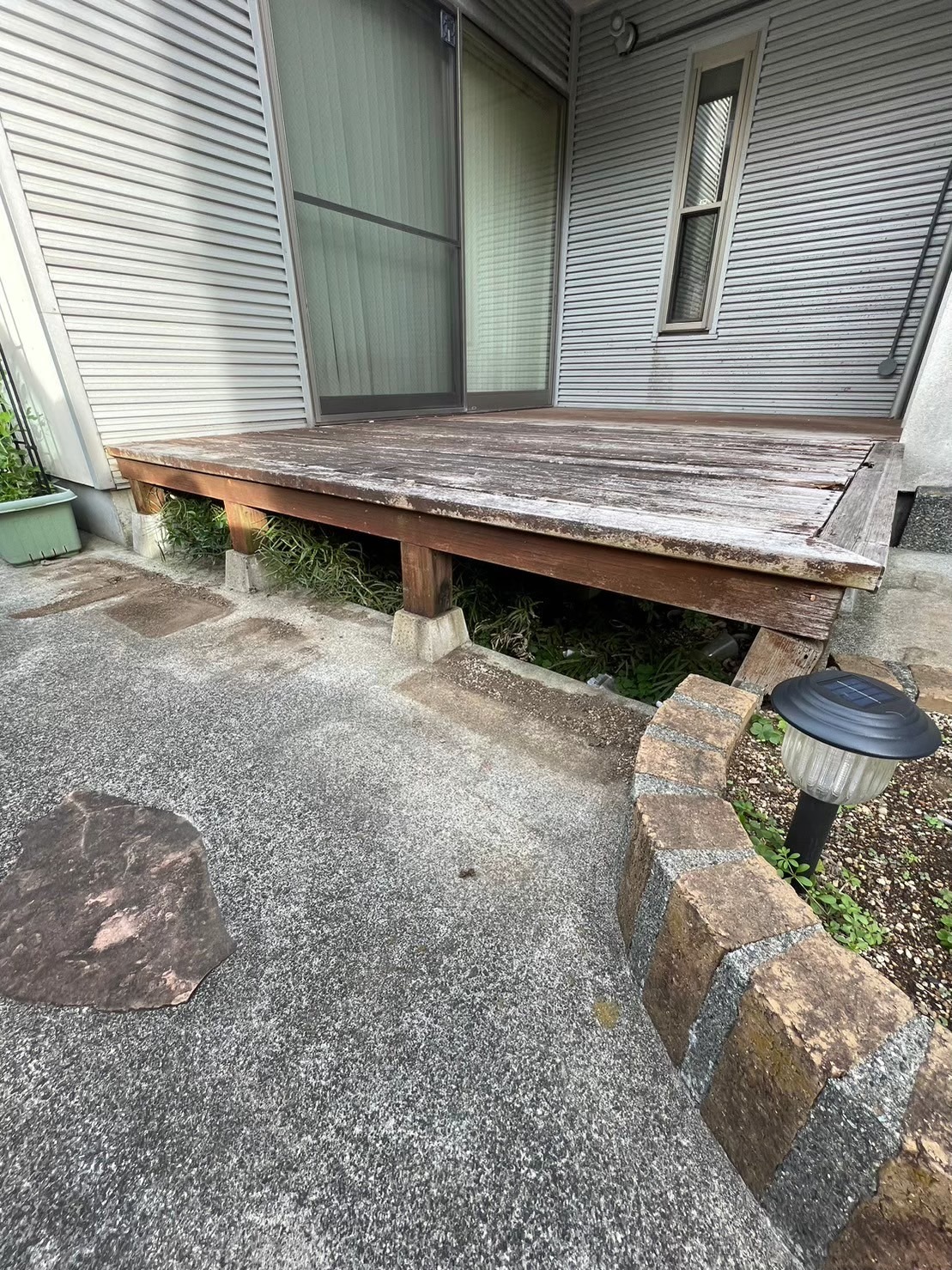 小田原 借家2棟ウッドデッキ改修工事 施工前 かなり腐食して、危険な状態です。 撤去後の写真を撮り忘れてしまいました…。束石、束の設置状況。 束、大引き施工状況。 完了! 綺麗に仕上がりました(^^ゞ新しいデッキ材は劣化を考慮し、樹脂デッキを採用しました。スッキリとしていい感じですね! 手摺もつけました。目隠し代わりにもなり、プライベート空間としても!