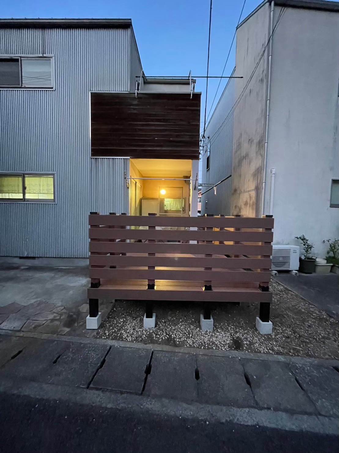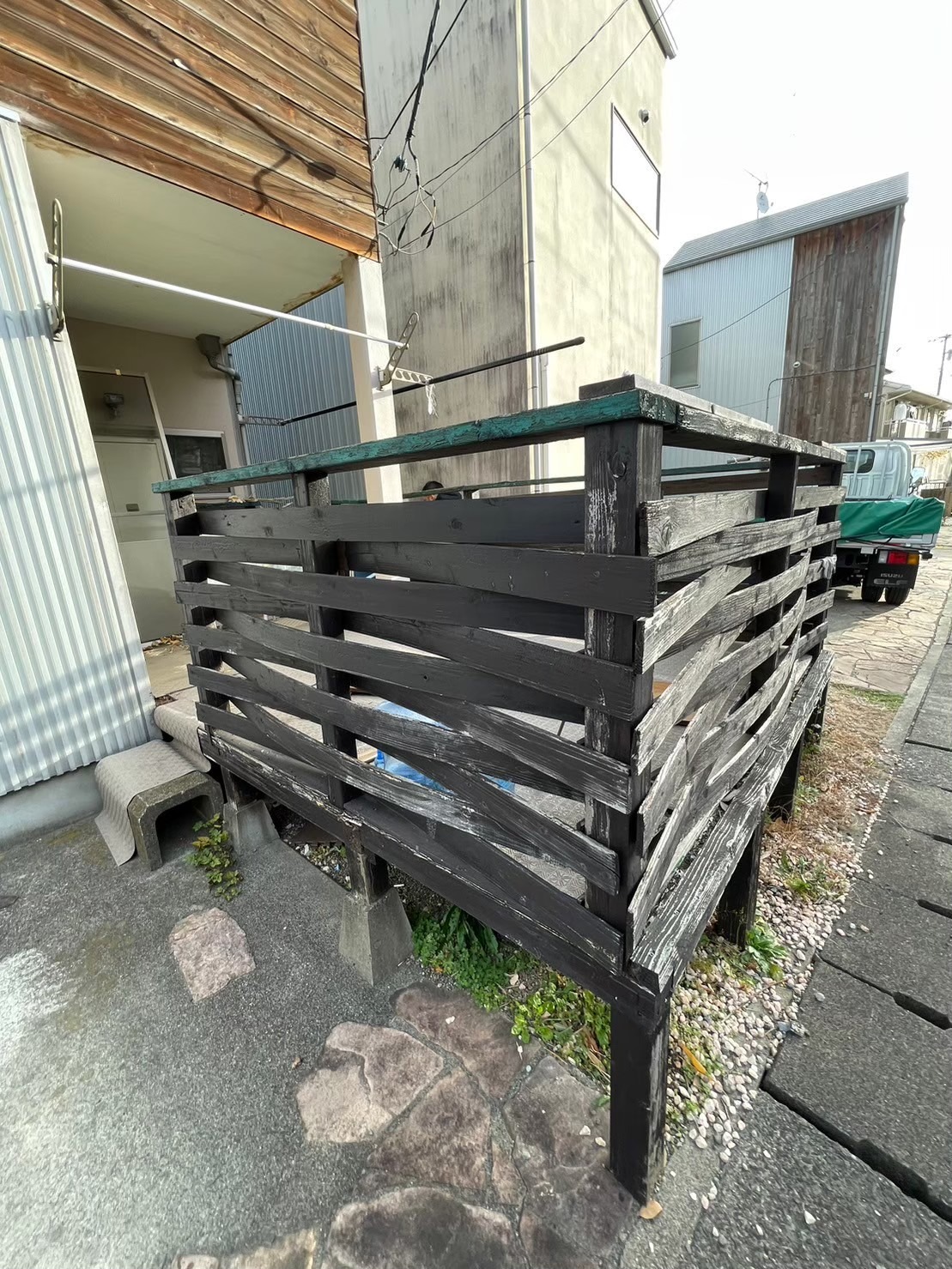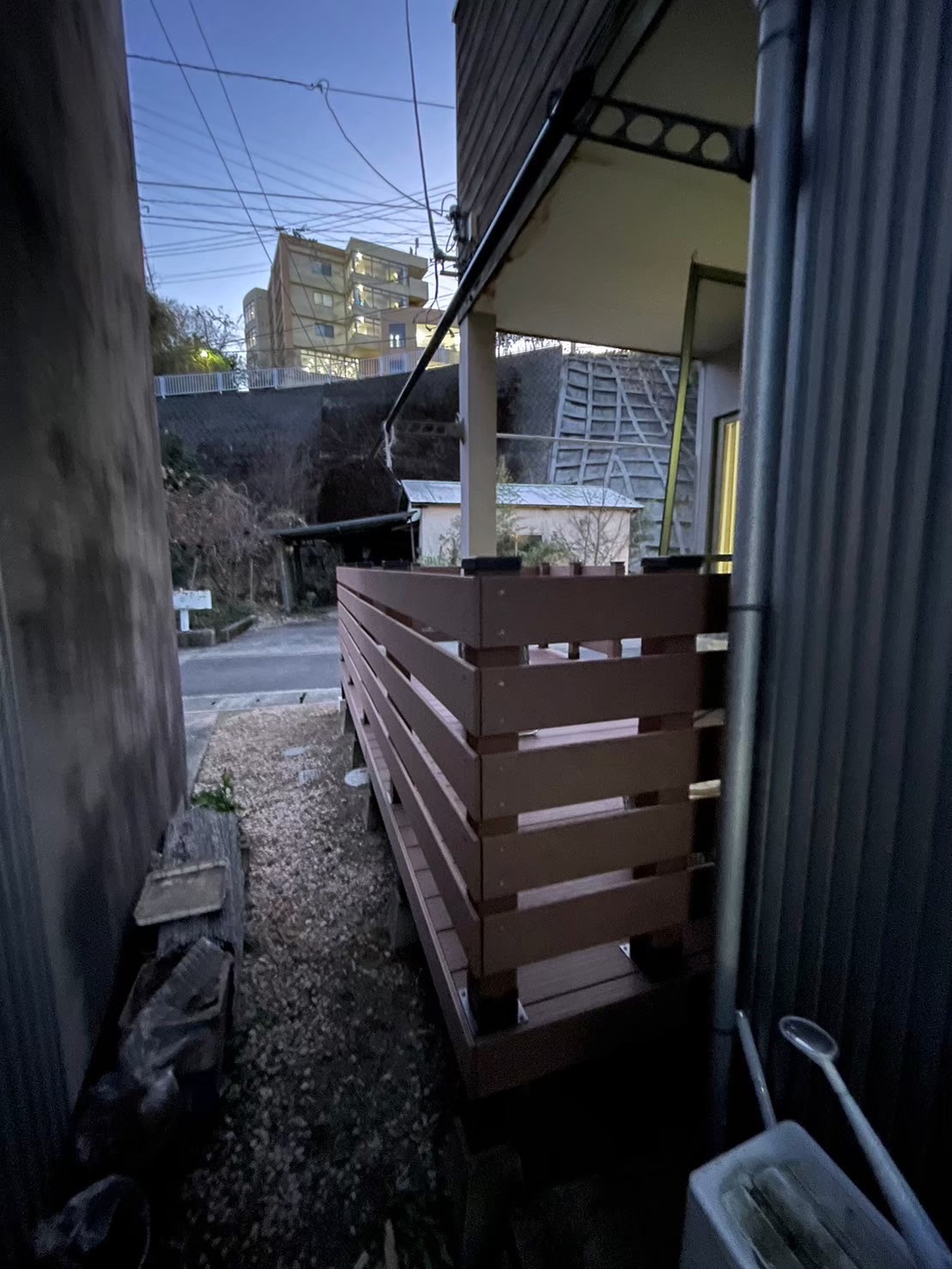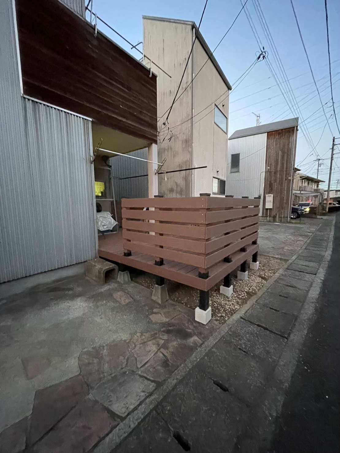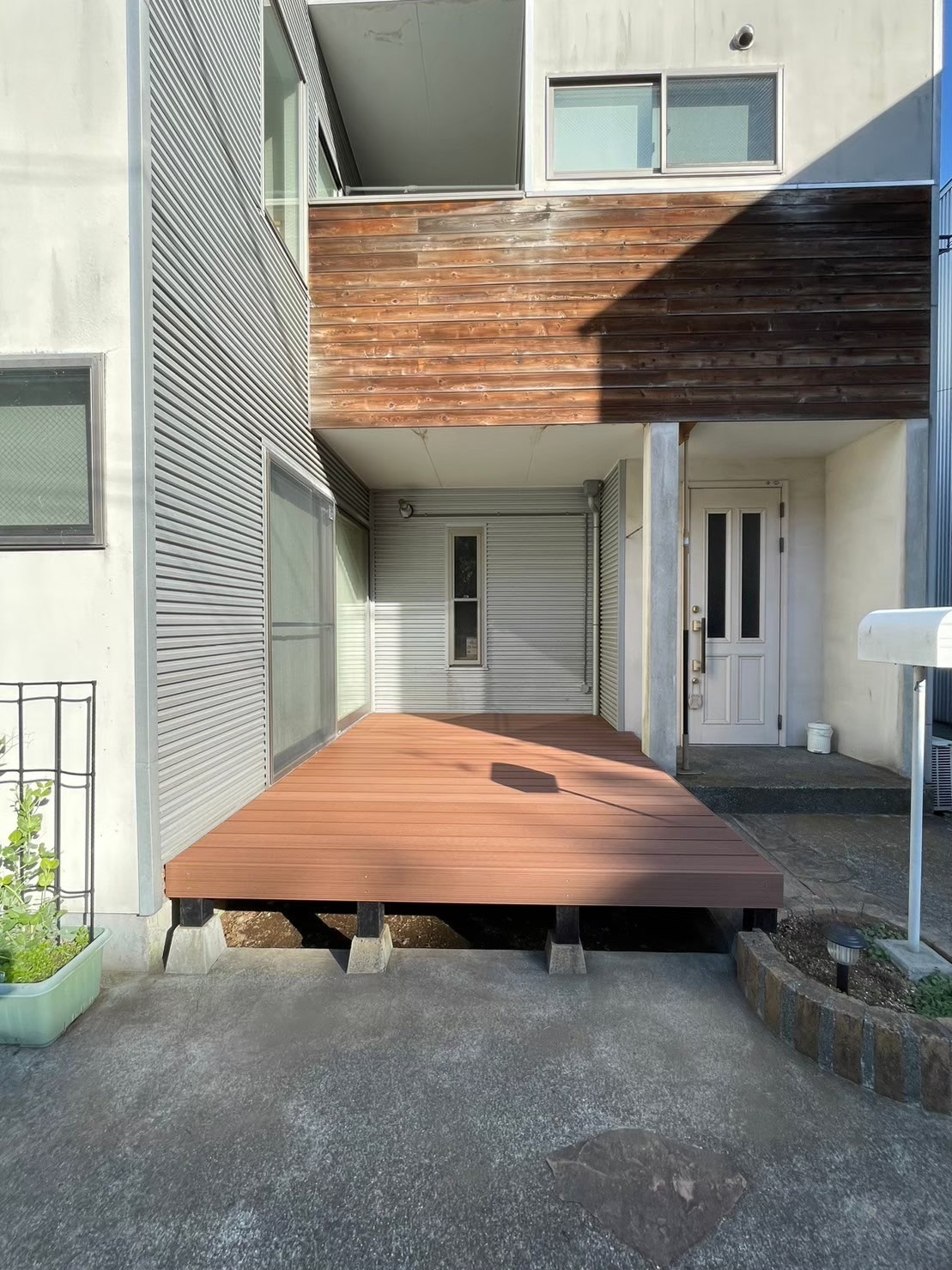 小田原 借家2棟ウッドデッキ改修工事 施工前 かなり腐食して、危険な状態です。 撤去後の写真を撮り忘れてしまいました…。束石、束の設置状況。 束、大引き施工状況。 完了! 綺麗に仕上がりました(^^ゞ新しいデッキ材は劣化を考慮し、樹脂デッキを採用しました。スッキリとしていい感じですね! 手摺もつけました。目隠し代わりにもなり、プライベート空間としても!