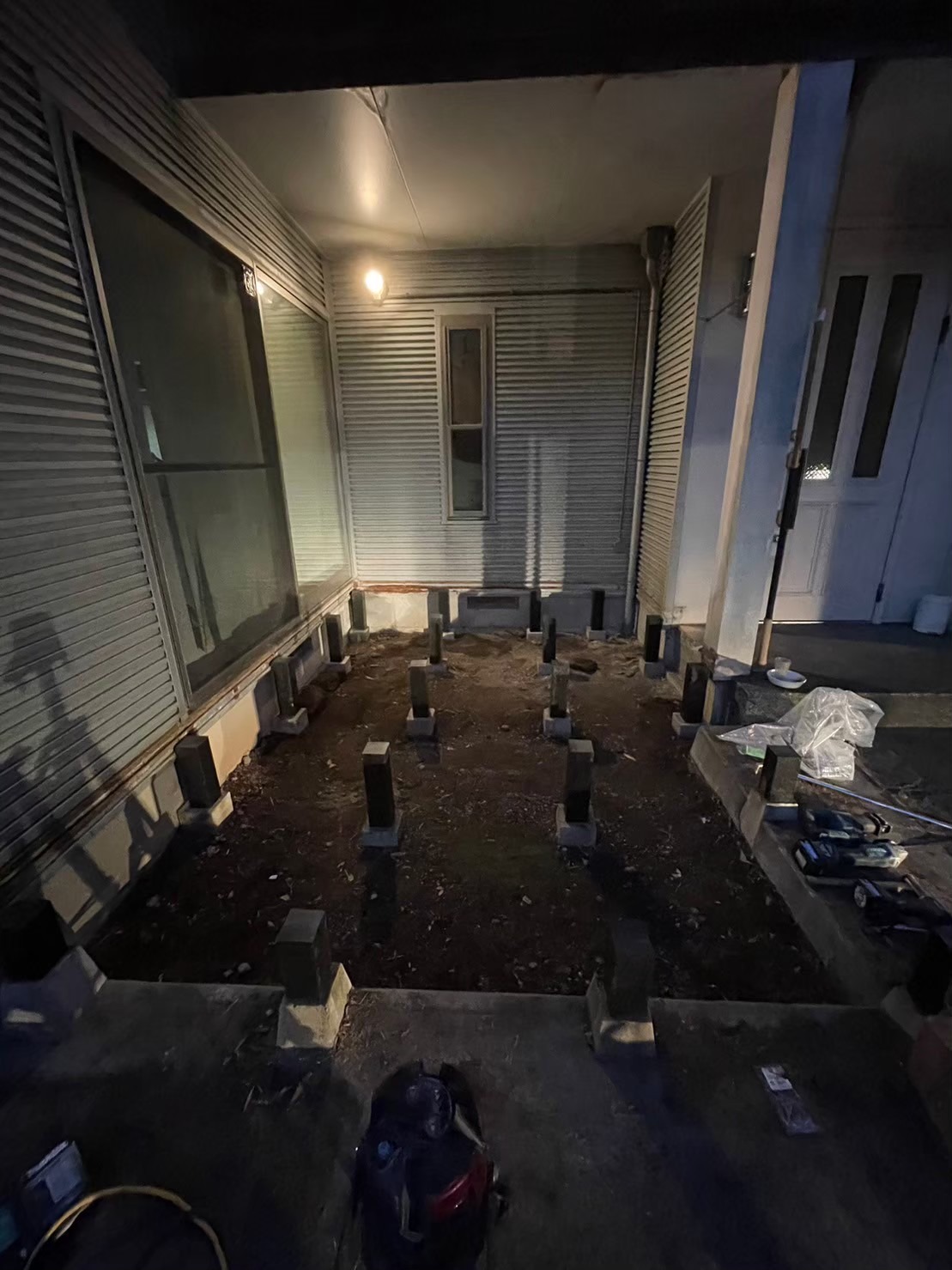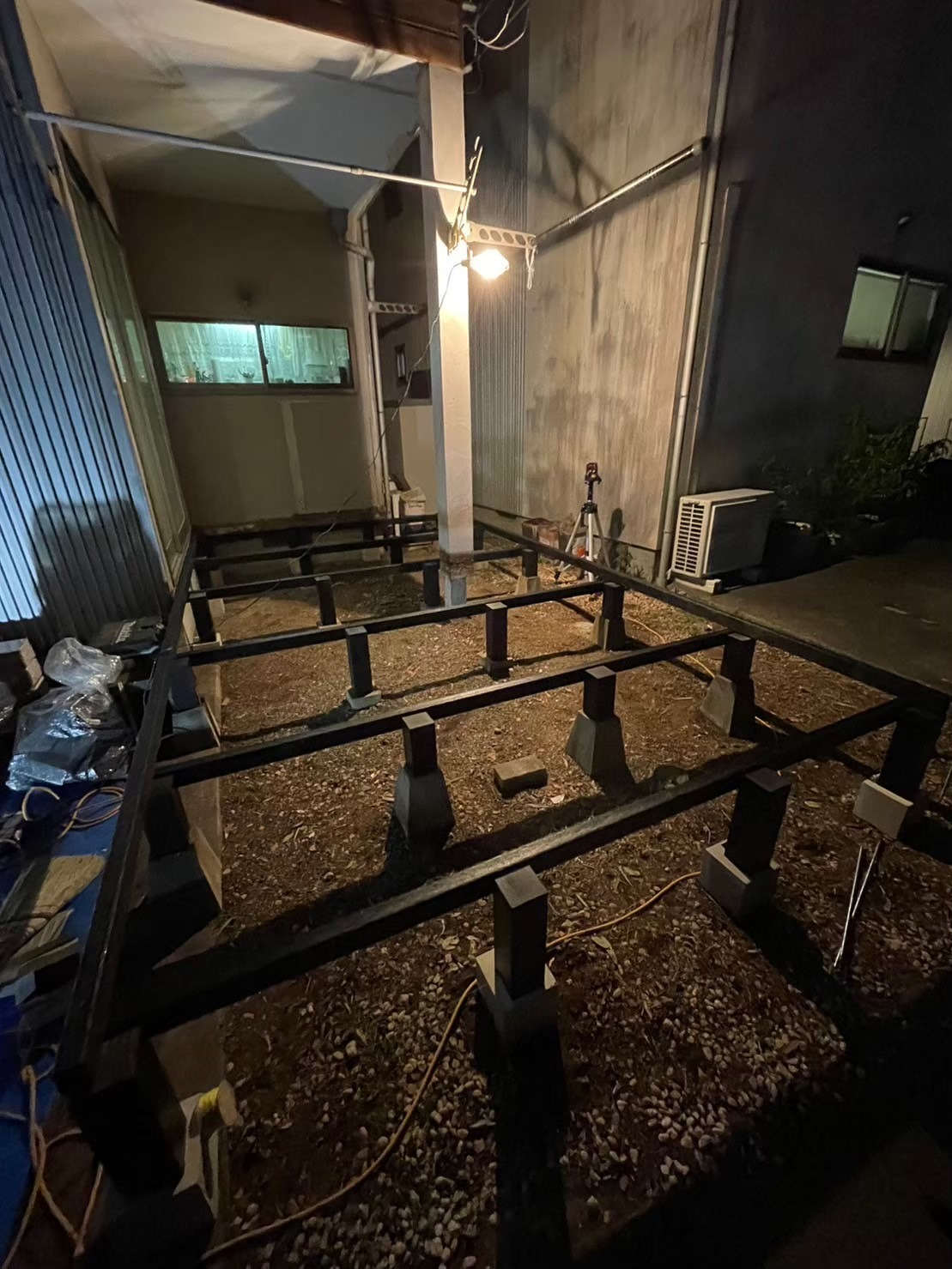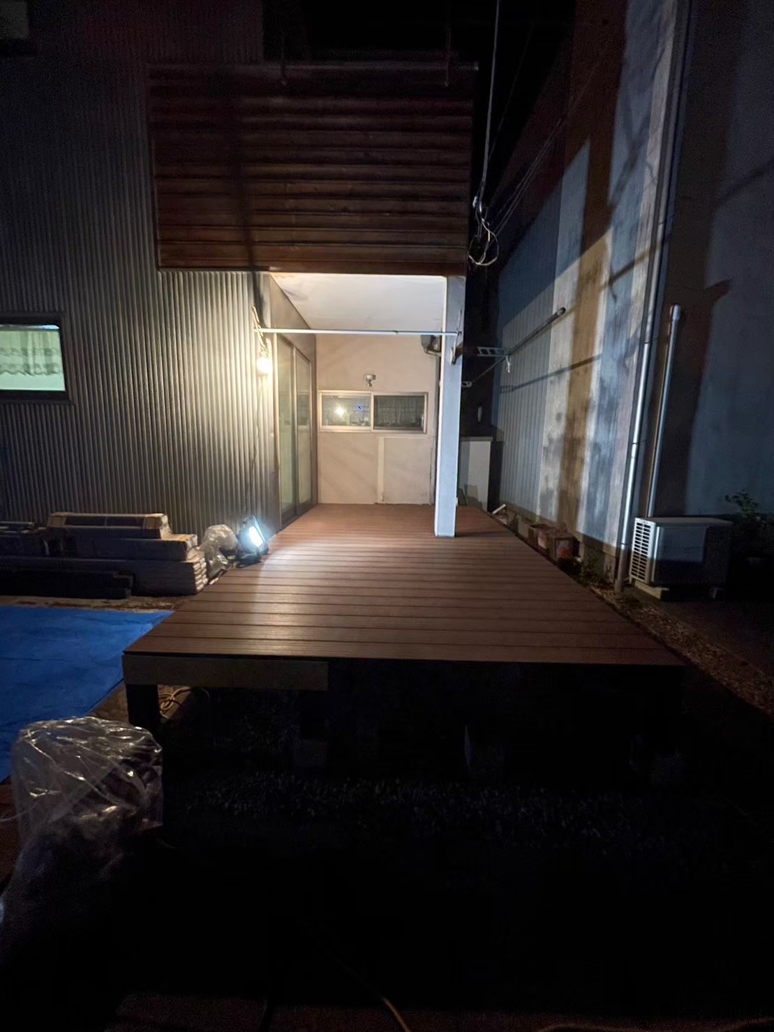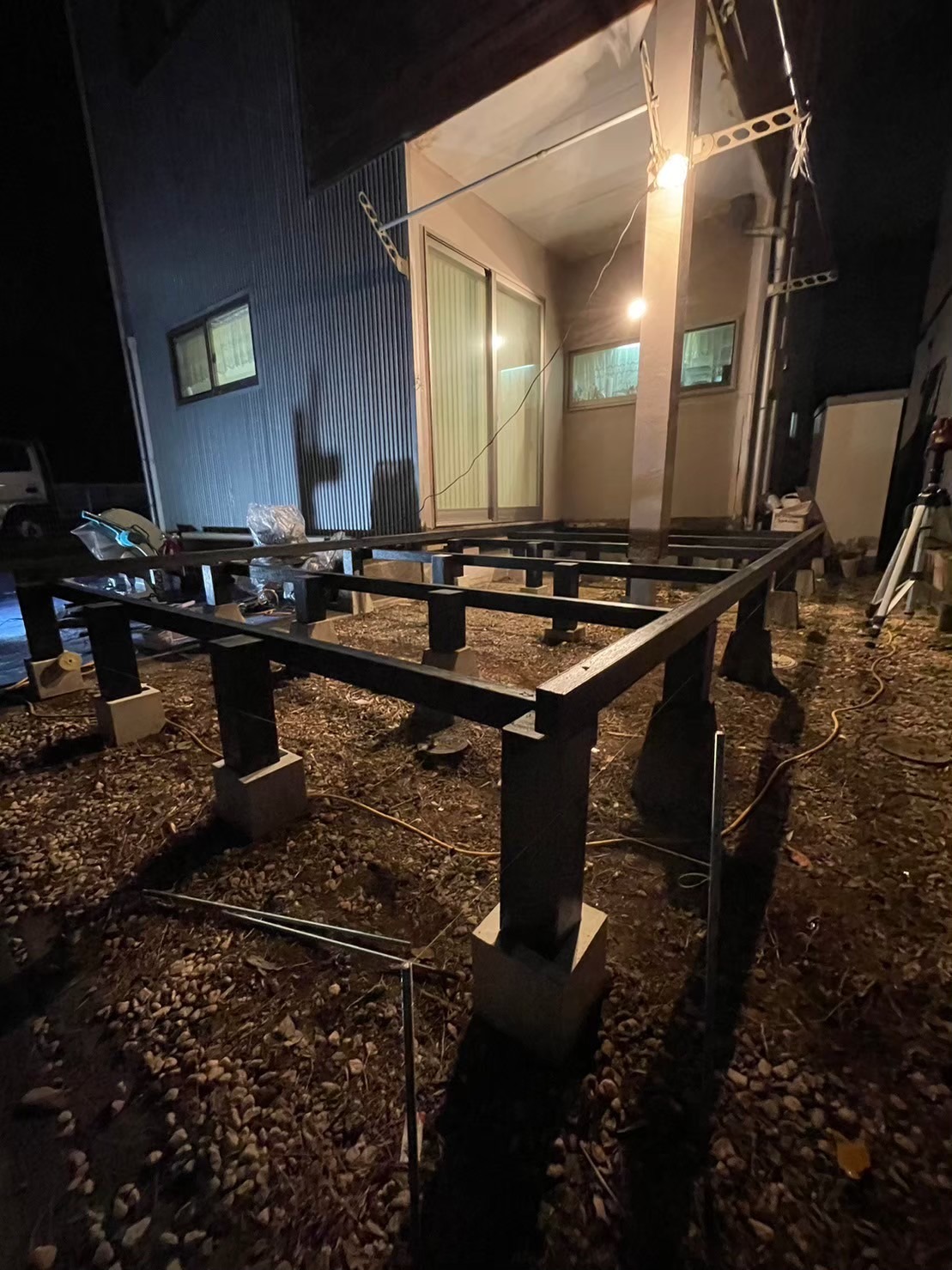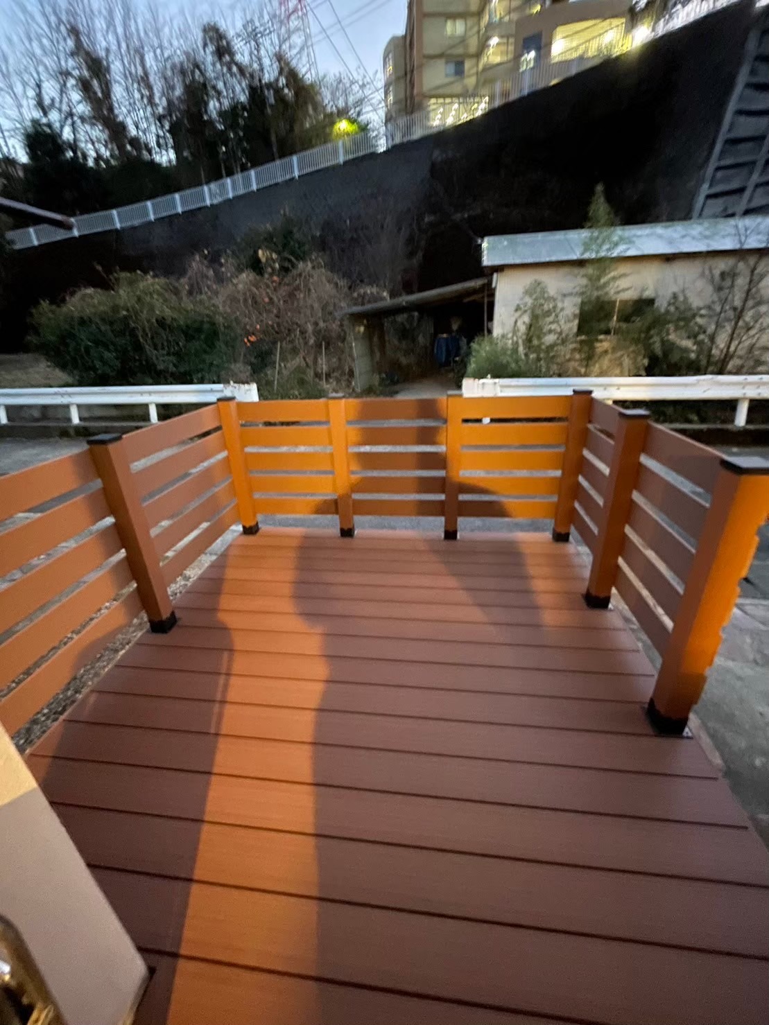 小田原 借家2棟ウッドデッキ改修工事 施工前 かなり腐食して、危険な状態です。 撤去後の写真を撮り忘れてしまいました…。束石、束の設置状況。 束、大引き施工状況。 完了! 綺麗に仕上がりました(^^ゞ新しいデッキ材は劣化を考慮し、樹脂デッキを採用しました。スッキリとしていい感じですね! 手摺もつけました。目隠し代わりにもなり、プライベート空間としても!